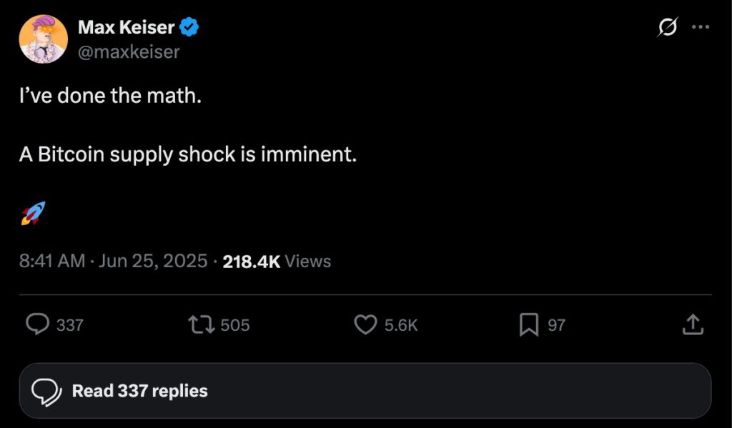 Max Keiser telah mengumumkan melalui cuitannya bahwa berdasarkan perhitungan yang dilakukan, kejutan pasokan Bitcoin (BTC) adalah hal yang pasti akan terjadi. “Saya telah melakukan perhitungan. Kejutan pasokan Bitcoin (BTC) sudah dekat,” tulis Keiser. Ia juga menambahkan emoji roket, menandakan ekspektasinya bahwa harga Bitcoin (BTC) akan melonjak tajam setelah kejutan pasokan ini terjadi.