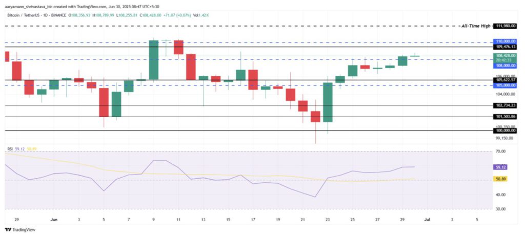 Tantangan terdekat bagi BTC adalah menembus resistensi di $109.476 dan mengubah $110.000 menjadi level dukungan. Dengan RSI yang masih berada di zona bullish, skenario ini tampaknya memungkinkan.