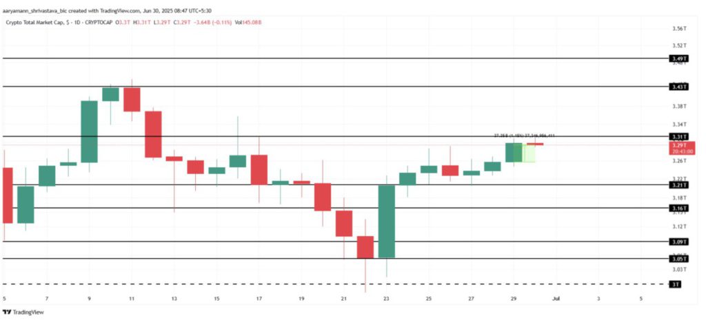 Kapitalisasi pasar crypto secara keseluruhan telah meningkat sebesar $37 miliar dalam 24 jam terakhir (30/6), dan kini mendekati level resistensi penting di angka $3,31 triliun.