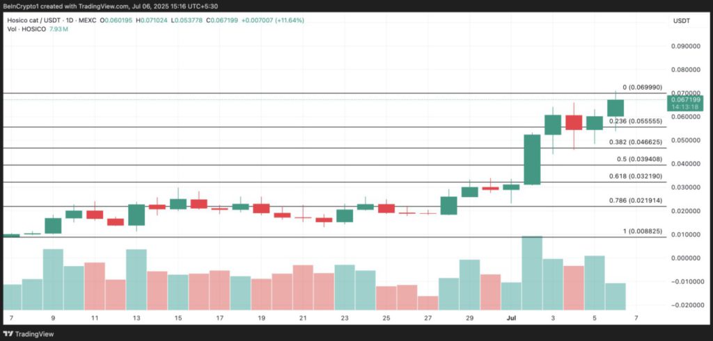 Meskipun pasar secara umum sedang mengalami penurunan, HOSICO mencatatkan kenaikan sebesar 16% dalam 24 jam terakhir (6/7). Sebagai gambaran, altcoin ini sempat menyentuh harga tertinggi sepanjang masa di $0,069 pada sesi perdagangan hari ini.