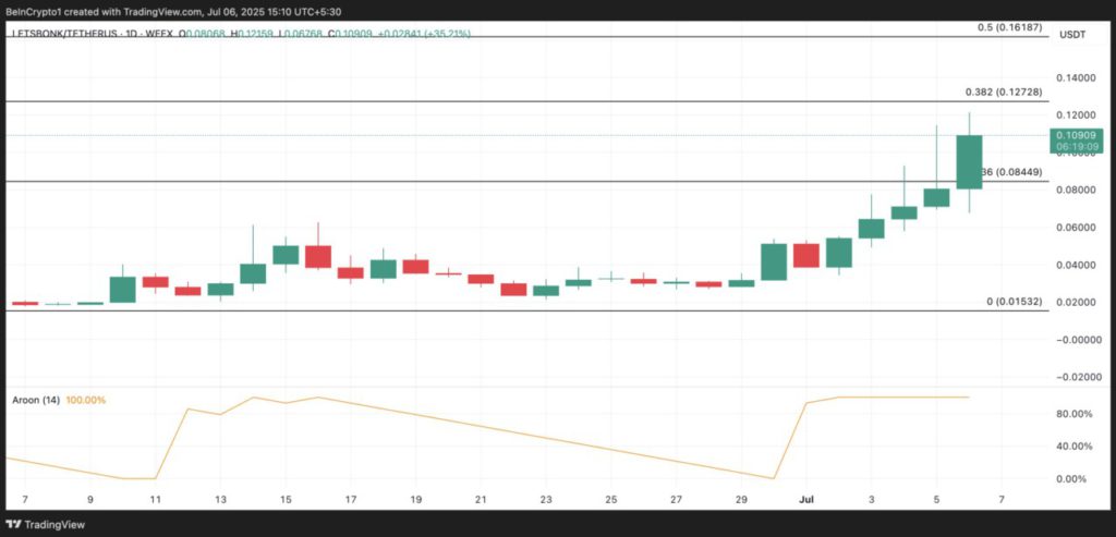 LetsBONK telah naik 239% dalam tujuh hari terakhir, menjadikannya salah satu meme coin dari ekosistem BONK yang layak dipantau. Per 6 Juli, garis Aroon Up token ini berada di angka 100%. Hal ini menunjukkan bahwa tren naiknya kuat dan bukan hanya didorong oleh spekulasi semata.