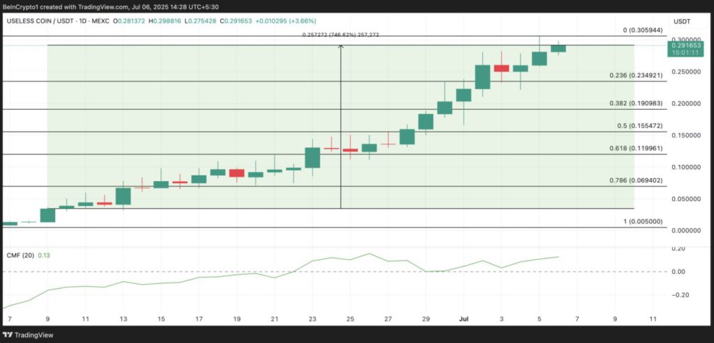 Pembacaan dari grafik harian USELESS/USD menunjukkan bahwa meme coin ini telah mencatatkan puncak harga harian baru sejak 5 Juni. Per 6 Juli, USELESS sempat diperdagangkan di harga $0,29, harga meme coin ini telah meroket lebih dari 740% dalam sebulan terakhir.