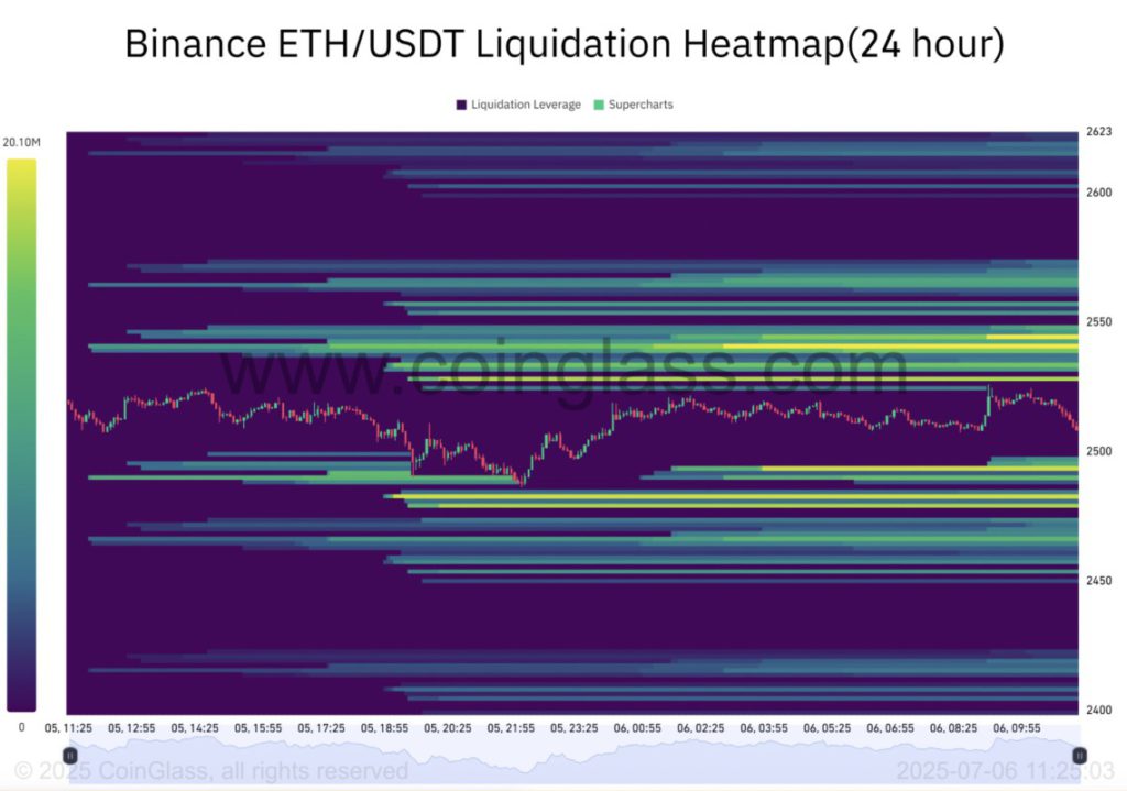 Liquidation Heatmap untuk pasangan Binance ETH/USDT menunjukkan adanya klaster liquidation yang padat di antara level $2.480 hingga $2.550, menjadikan zona ini sebagai titik tekanan penting.