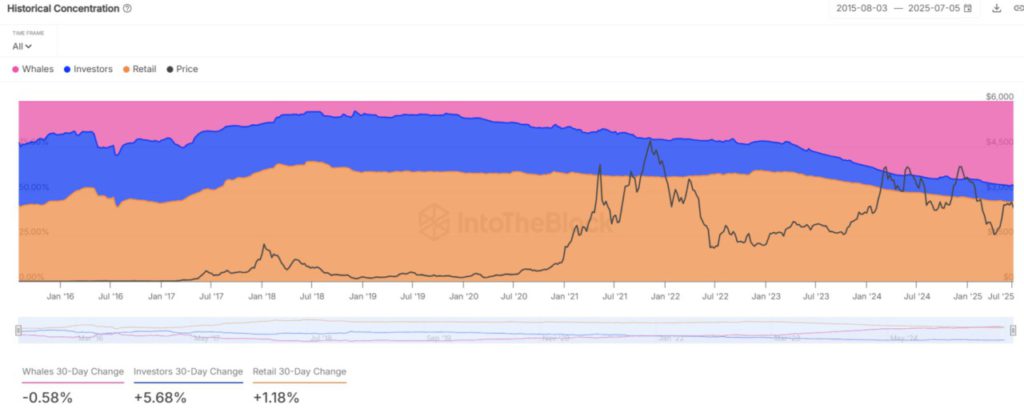 Komposisi investor Ethereum telah berubah secara signifikan dalam 30 hari terakhir. Kepemilikan oleh whales turun 0,58%, sementara segmen investor dan ritel masing-masing naik sebesar 5,68% dan 1,18%.
