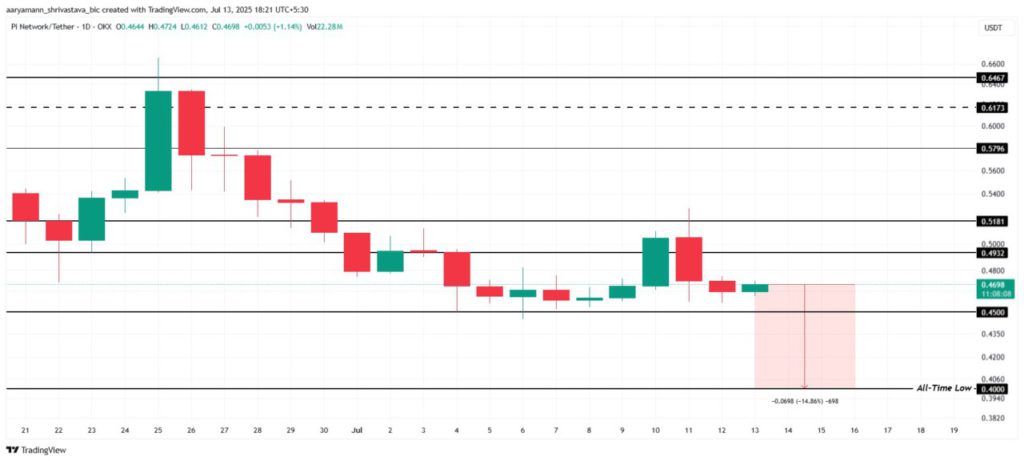Harga Pi Coin saat ini dilaporkan bergerak mendekati titik terendah sepanjang sejarahnya. BeInCrypto menyebutkan bahwa jika level support seperti USD 0,49 atau USD 0,40 gagal dipertahankan, harga bisa jatuh lebih dalam. Beberapa analis juga menyoroti fakta bahwa volume perdagangan PI menurun tajam, menandakan turunnya minat pasar terhadap aset ini.
