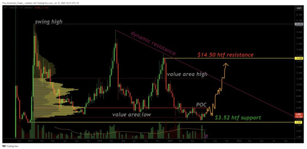 Selama beberapa tahun terakhir, Aptos telah menunjukkan pola konsisten yang berputar antara resistansi tren turun dan support jangka panjang. Perilaku yang berulang ini mengimplikasikan struktur osilasi yang terus berlanjut kecuali terjadi breakout yang tegas.