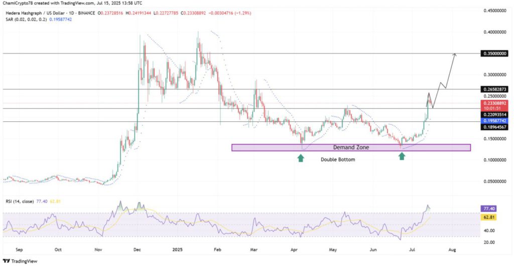 Dilansir dari Coingape, Hedera telah mengalami gelombang bullish yang kuat yang dimulai di zona permintaan $0.15, mengonfirmasi pola pembalikan double-bottom dan merebut kembali struktur mid-range sebelumnya.