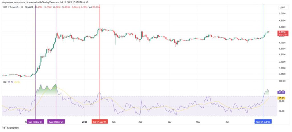 Mengutip laporan BeInCrypto, melihat indikator teknikal, RSI (Relative Strength Index) saat ini berada di wilayah overbought, melampaui ambang batas 70.0. Ini menunjukkan bahwa XRP mungkin sedang berada dalam fase rally yang panjang, mirip dengan kejadian sebelumnya ketika harga melonjak hingga kondisi overbought.