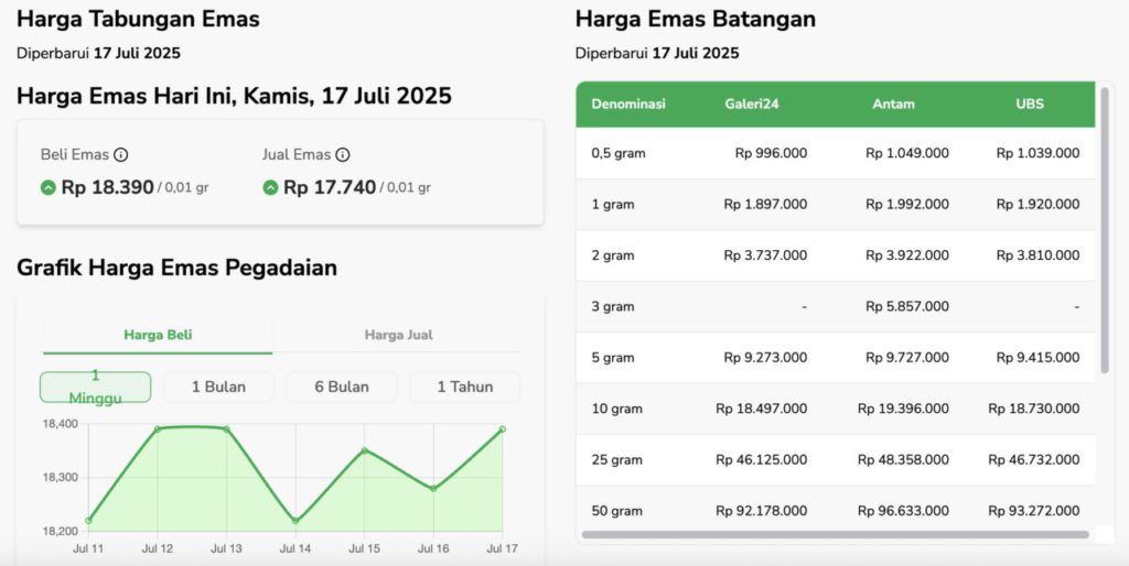 Pada hari ini, Kamis, 17 Juli 2025, Pegadaian kembali memperbarui harga emas, baik dalam bentuk tabungan emas maupun emas batangan dari berbagai produsen seperti Antam, UBS, dan Galeri24.