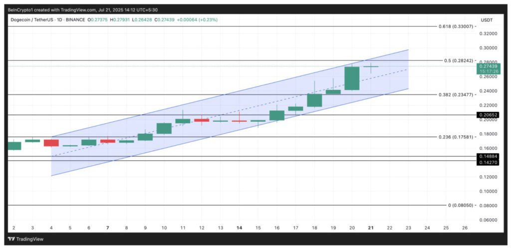 Pada 21 Juli, DOGE melonjak 32% selama sepekan terakhir dan diperdagangkan di harga $0,2743.