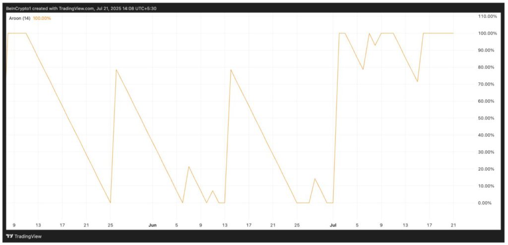 Dengan posisi Aroon Up di 100%, ini mengisyaratkan bahwa DOGE secara konsisten mencetak harga tertinggi baru di setiap periode dalam jangka waktu yang dianalisis oleh indikator Aroon—menunjukkan tren naik yang sangat kuat dan stabil.
