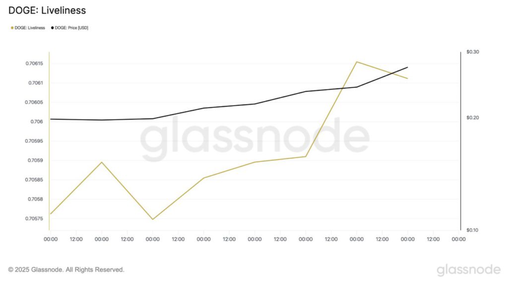 Menurut data dari Glassnode, metrik Liveliness DOGE mengalami peningkatan seiring lonjakan harga selama seminggu terakhir. Pada 20 Juli, metrik ini tercatat di angka 0,706, naik 0,14% dibandingkan 13 Juli.