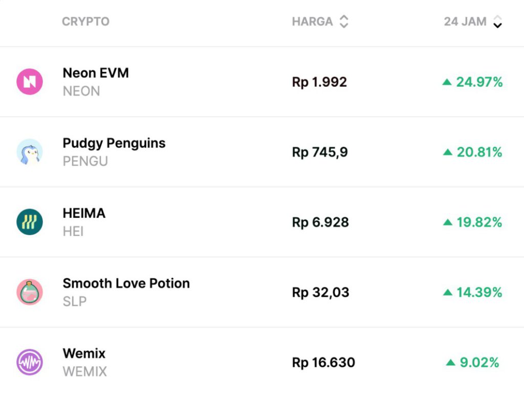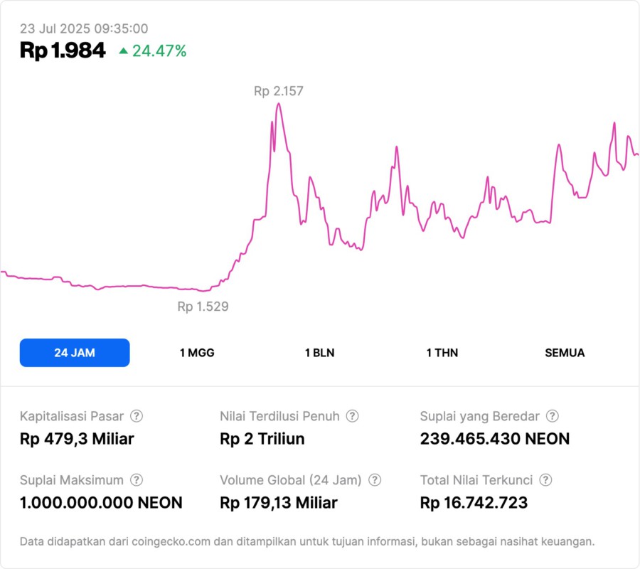 Neon EVM menempati posisi teratas sebagai aset kripto dengan kenaikan harga paling signifikan, yakni melonjak sebesar 24,97% dalam 24 jam terakhir menjadi Rp1.992 per koin. Kenaikan ini didorong oleh meningkatnya volume transaksi dan sentimen positif terkait pengembangan teknologi Ethereum Virtual Machine (EVM) yang diusung Neon.
