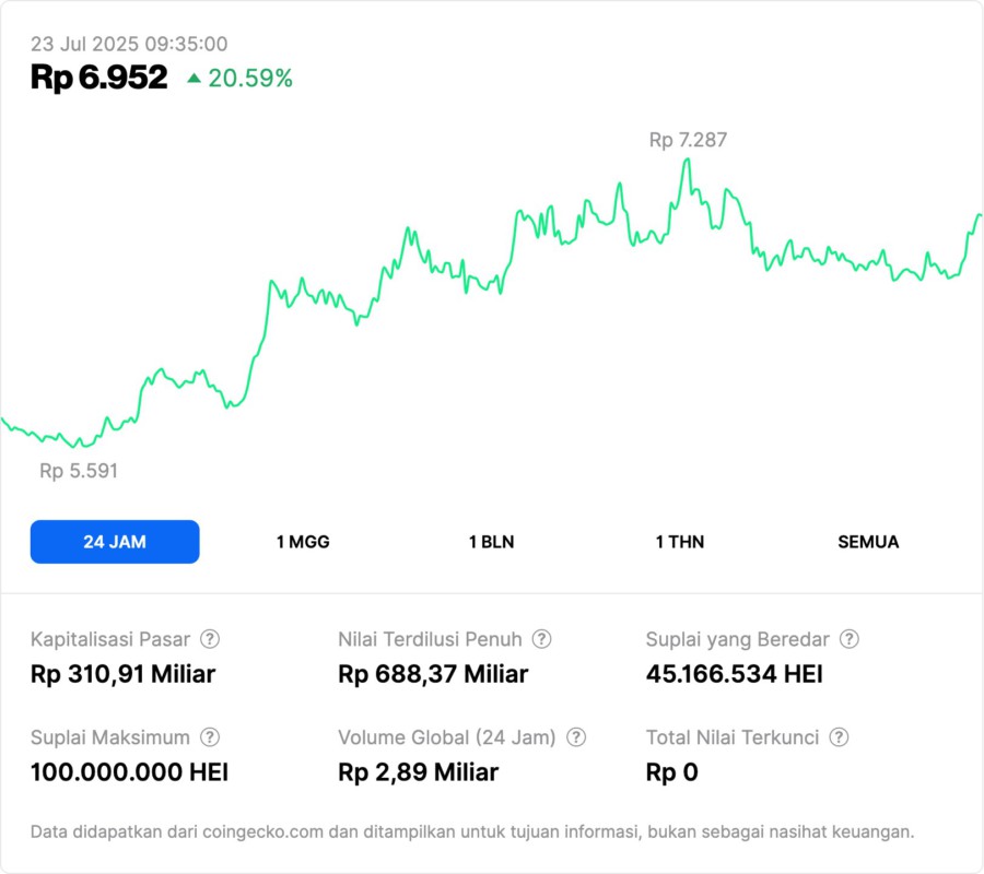 HEIMA mencatat kenaikan 19,82% dalam 24 jam, membawa harganya menjadi Rp6.928 per koin. Proyek HEIMA dikenal sebagai ekosistem Web3 yang fokus pada solusi digital inovatif di bidang hiburan dan gaya hidup.