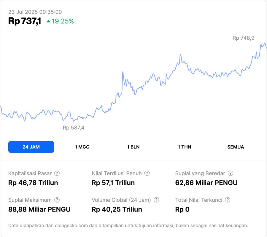Pudgy Penguins tak mau kalah dengan kenaikan tajam sebesar 20,81% menjadi Rp745,9 per koin hari ini. PENGU merupakan token yang terafiliasi dengan salah satu koleksi NFT populer yang mengusung tema pinguin lucu dan memiliki basis komunitas global yang sangat aktif.