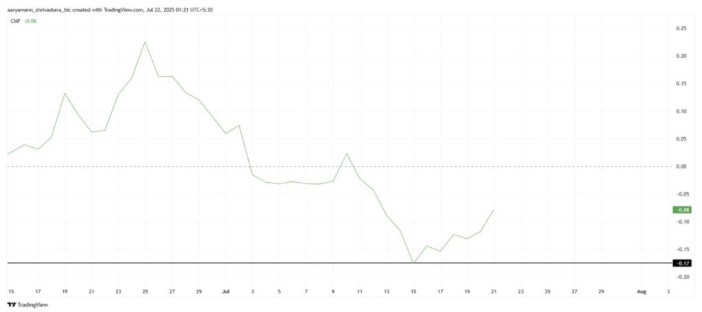 Indikator makro juga menunjukkan prospek yang optimis. Indikator Chaikin Money Flow (CMF) menunjukkan tren naik, yang menandakan adanya aliran modal masuk ke Pi Coin.