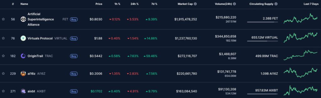 ai16z mencatat pertumbuhan 7,64% selama seminggu dengan harga $0,2006 atau sekitar Rp3.269 per token. Kapitalisasi pasar AI16Z tercatat $220 juta dengan volume transaksi harian mencapai $131 juta dan suplai 1,09 miliar token. Proyek ini menonjol sebagai salah satu token komunitas AI yang memiliki ekosistem kreator dan inovator AI.
