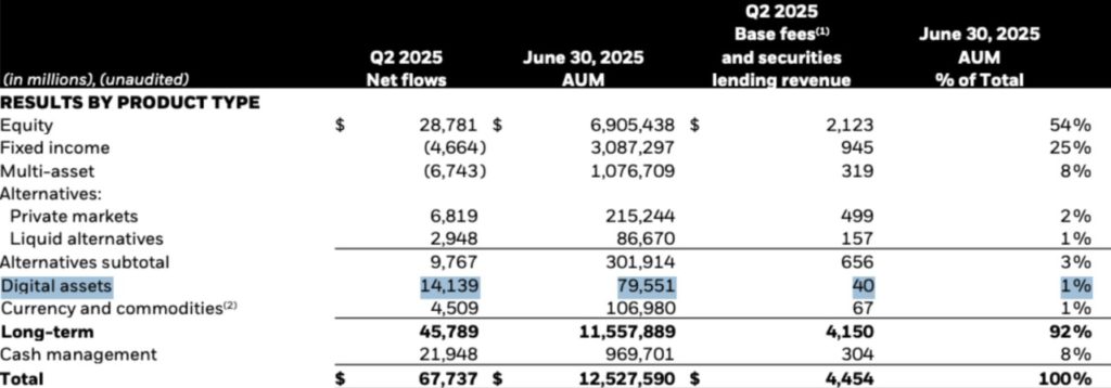Dana masuk ke produk crypto ini menyumbang 16,5% dari total aliran dana ETF BlackRock sebesar $85 miliar di kuartal kedua, meningkat signifikan dibandingkan dengan kontribusi di bawah 3% pada kuartal pertama 2025.