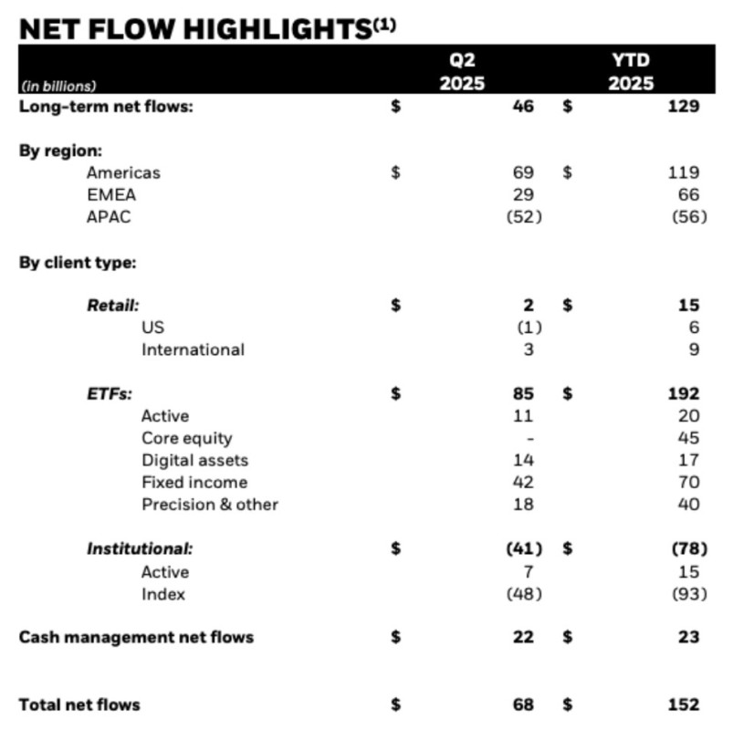 Namun demikian, total aliran dana masuk ke BlackRock mengalami penurunan sebesar 19%, dari $84 miliar pada kuartal pertama menjadi $68 miliar pada kuartal kedua.