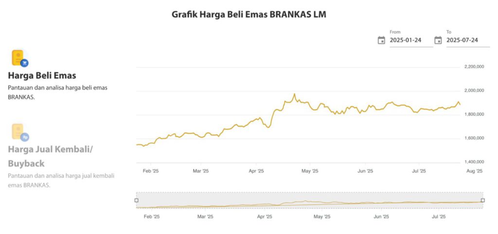 Berdasarkan grafik harga emas Antam BRANKAS LM dari Januari hingga 24 Juli 2025, terlihat adanya pola kenaikan signifikan pada kuartal kedua, disusul koreksi tajam beberapa minggu terakhir. Pola ini juga terlihat pada instrumen investasi global, di mana pasar crypto yang sangat dinamis mempengaruhi pergerakan harga emas secara tidak langsung.
