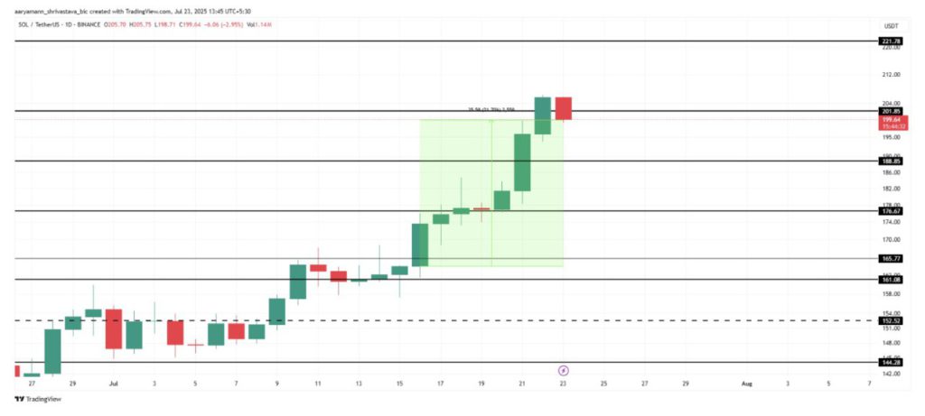 Harga Solana telah naik sebesar 21% dalam sepekan terakhir dan kini diperdagangkan di angka $199. Meskipun sempat menembus level $200, Solana gagal mempertahankan posisi tersebut, meski itu merupakan level tertinggi dalam lima bulan terakhir.