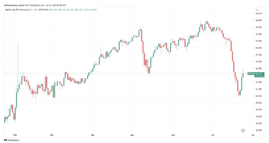 Dominasi BTC naik 0,5% pada 24 Juli, melanjutkan pemulihan yang sudah ada setelah hampir mencapai 60%.