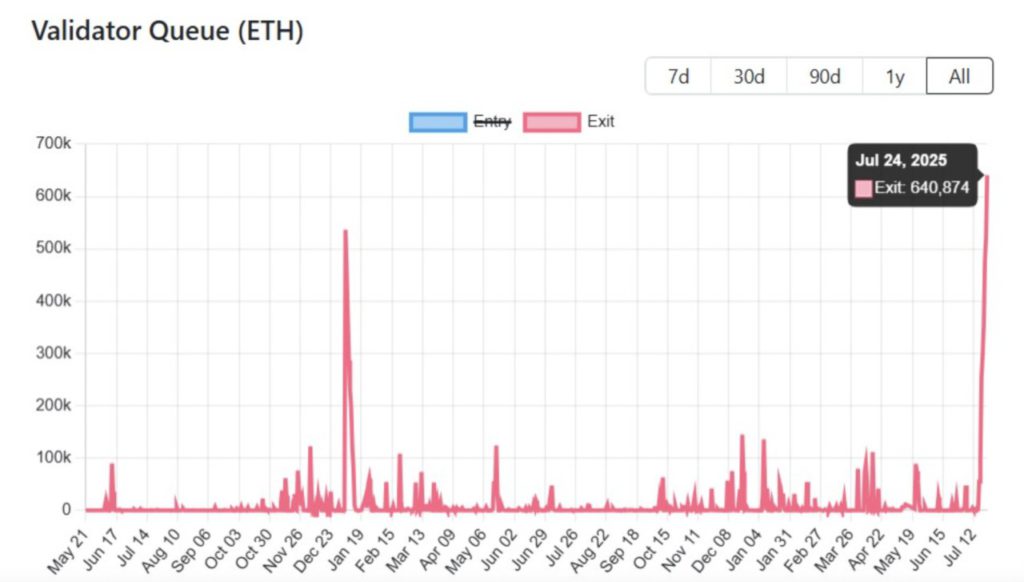 Antrian keluar validator Ethereum tiba-tiba melonjak lebih dari 640.000 ETH. Ini adalah jumlah tertinggi yang pernah tercatat keluar dari jaringan sekaligus. Situasi ini bisa berarti mereka hanya menjual untuk meraih keuntungan, dan jika ini memang yang terjadi, harga ETH bisa turun ke $2.800.