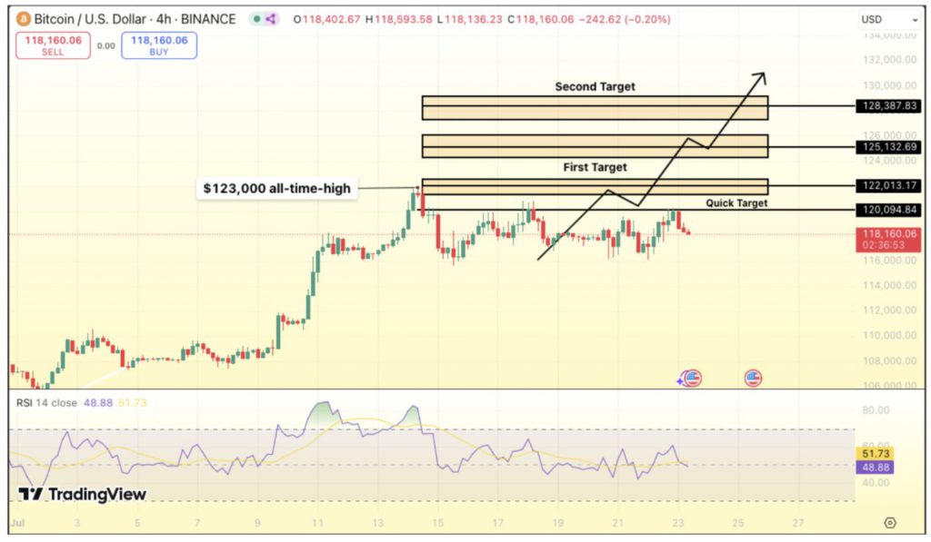 Dilansir dari Crypto News (23/7), Bitcoin sempat diperdagangkan di level $118.160, mencatat penurunan ringan sebesar 0,20% dari rekor tertingginya baru-baru ini di $123.000.