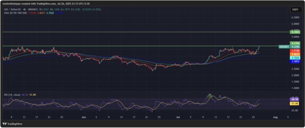 Sui (SUI) telah melonjak di atas resistensi $4,2, dan para pembeli berhasil mempertahankan harga di atas level breakout tersebut. Hal ini menunjukkan bahwa pembeli mencoba mengubah level $4,2 menjadi dukungan. Saat ini, Sui (SUI) diperdagangkan di $4,3, naik lebih dari 13% dalam 24 jam terakhir.