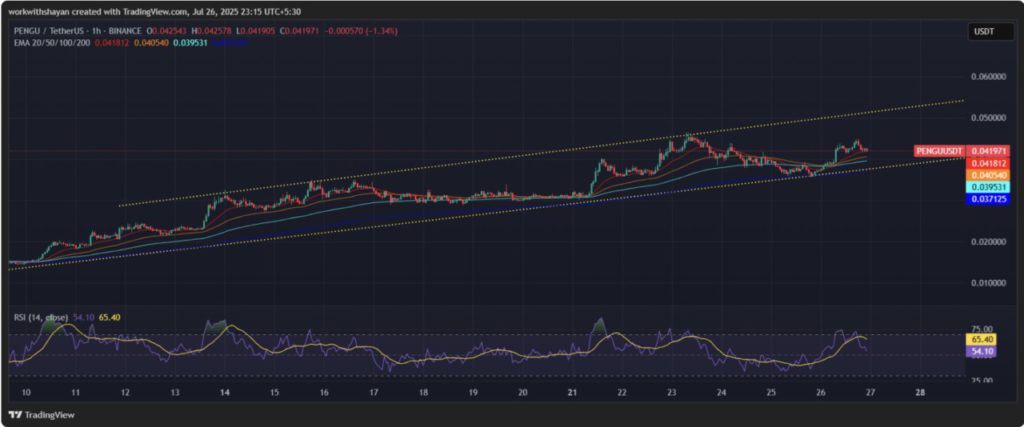 Harga Pudgy Penguins (PENGU) saat ini terjebak dalam pertarungan ketat antara pembeli dan penjual di sekitar tanda $0,045. Jika harga turun dan ditutup di bawah level EMA20, penjual mungkin mendorongnya turun ke $0,036.