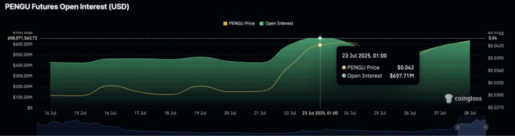 Data dari pasar derivatif turut menyoroti hal ini. Menurut Coinglass, open interest untuk PENGU meningkat tajam sebesar 54% dalam waktu hanya 48 jam, naik dari $426 juta menjadi $657 juta.
