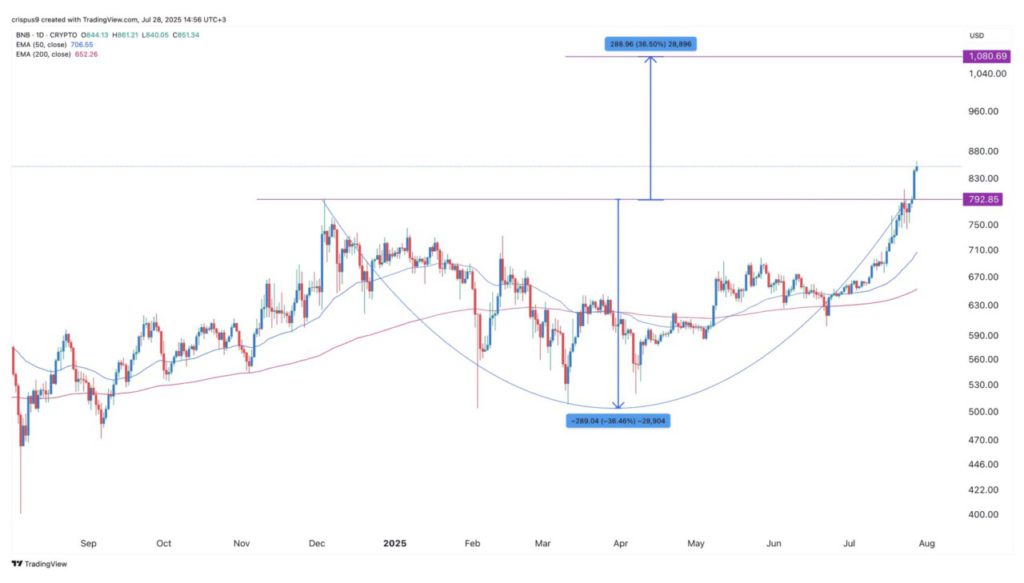 BNB membentuk pola cup and handle, yaitu pola lanjutan yang umum dalam analisis teknikal. Pola ini memiliki kedalaman sekitar 36%, yang mengindikasikan potensi kenaikan harga hingga $1.080.