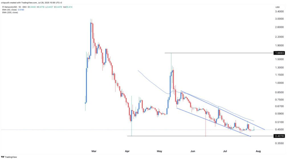 Harga Pi juga membentuk pola falling wedge, yang ditandai dengan dua garis tren menurun yang saling menyempit. Pola ini umumnya menunjukkan potensi kenaikan lebih lanjut.