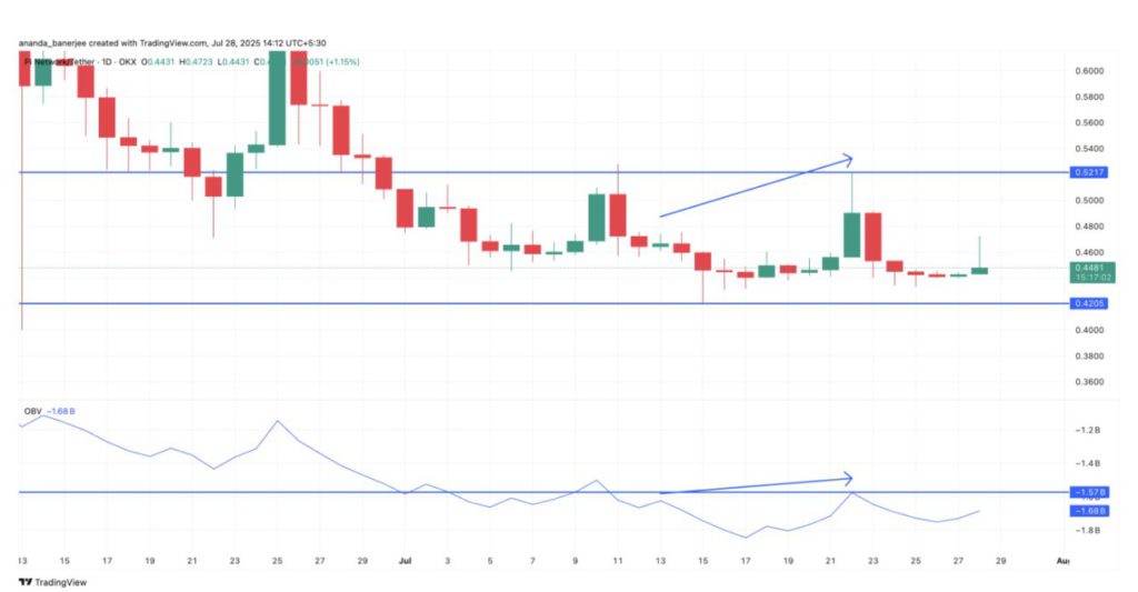 Indikator On-Balance Volume (OBV) telah memulai untuk menunjukkan tanda-tanda awal dari intensi bullish. Antara tanggal 13 hingga 22 Juli, harga Pi Coin mengalami peningkatan yang signifikan, dan OBV mengikuti dengan mencatatkan high yang lebih tinggi.