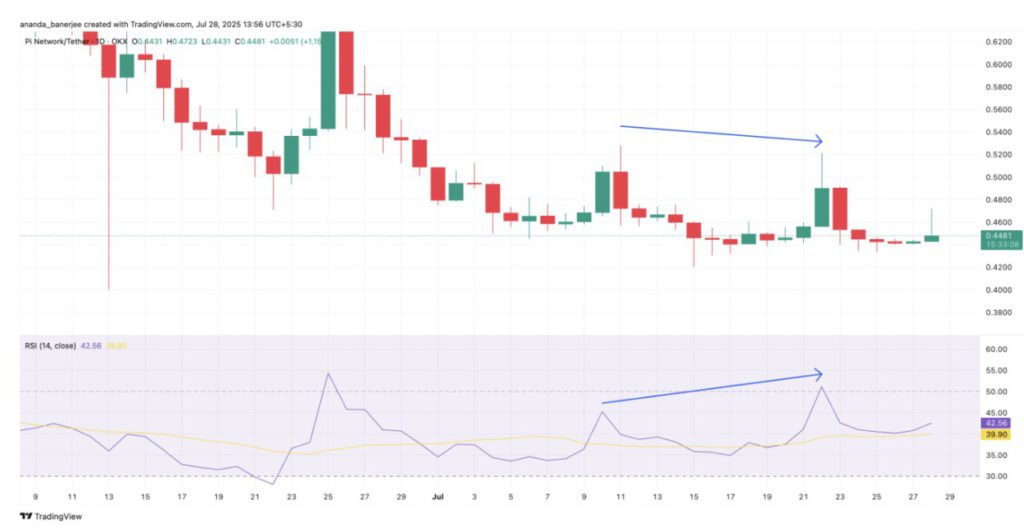 Indeks Kekuatan Relatif (RSI) juga menunjukkan tanda-tanda kebangkitan. Meskipun harga Pi Coin terus mencetak high yang lebih rendah, RSI bergerak dalam trajektori naik. Divergensi bullish ini menunjukkan bahwa tekanan bearish mulai berkurang; sebuah divergensi antara harga dan kekuatan yang mendasarinya.