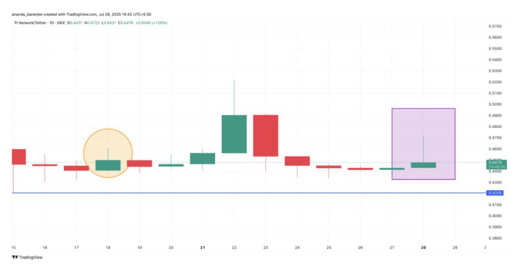 Sinyal bullish terakhir datang dari pola candlestick. Pada tanggal 28 Juli, Pi Coin mencetak inverted hammer hijau, sebuah candlestick dengan badan nyata kecil dekat rendah dan sumbu atas yang panjang, menunjukkan breakout yang gagal atau pengujian resistensi.