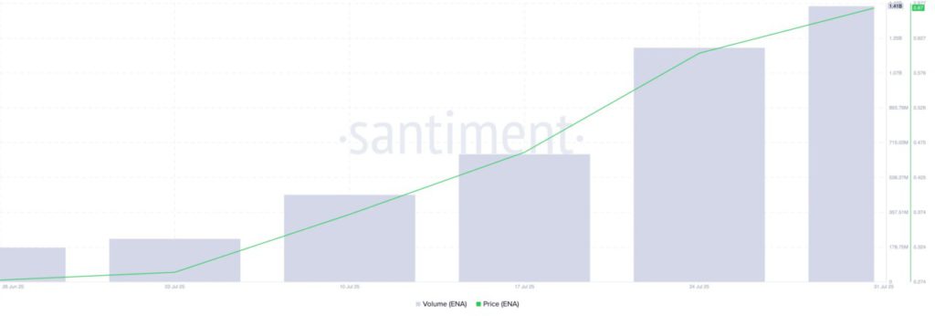 Data on-chain menunjukkan bahwa lonjakan harga ENA didorong oleh permintaan yang autentik, bukan hanya spekulasi jangka pendek. Volume perdagangan mingguan ENA melonjak lebih dari 700%, mencapai $1,41 miliarānilai tertinggi dalam lebih dari satu tahun.