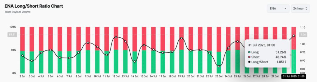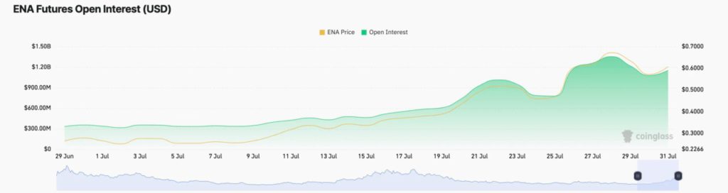 Data pasar berjangka menunjukkan peningkatan kepercayaan investor. Minat terbuka pada ENA telah meningkat lebih dari 30% dalam 24 jam terakhir, mencapai $1,15 miliar. Minat terbuka mengacu pada jumlah total kontrak derivatif, seperti futures atau opsi, yang belum diselesaikan.