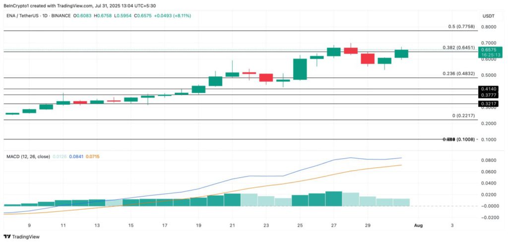 Indikator teknikal juga mendukung potensi kenaikan lebih lanjut. Moving Average Convergence Divergence (MACD) ENA tetap dalam pola crossover bullish pada grafik harian. Ini terjadi ketika garis MACD (biru) berada di atas garis sinyalnya (oranye), sebuah sinyal yang sering dikaitkan dengan momentum naik yang berkelanjutan.