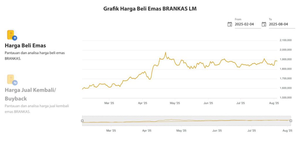 Dari grafik harga beli emas BRANKAS LM periode Februari – Agustus 2025, terlihat adanya kenaikan signifikan di bulan Maret hingga April.