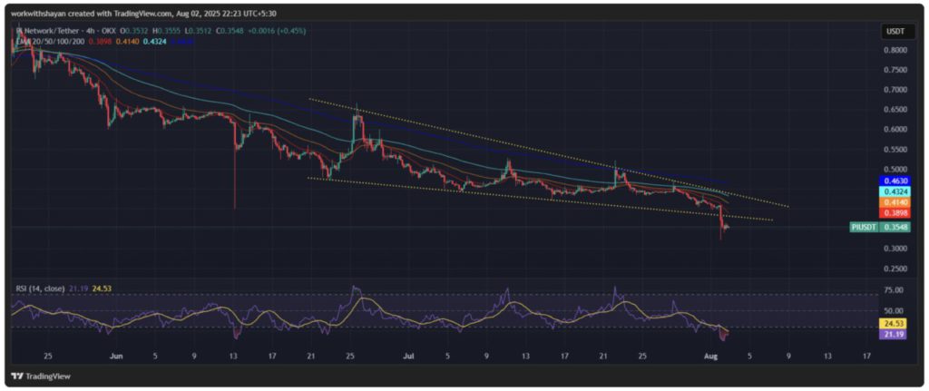Pi Coin ditutup di bawah level breakout kunci $0,38 dan turun hingga menyentuh 20-day simple moving average (SMA) di $0,32.