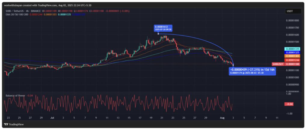 Shiba Inu sedang berada dalam tren turun yang tajam, setelah merosot lebih dari 27% hanya dalam dua minggu terakhir. Pada 2 Agustus, harga SHIB sempat berada di $0,00001179, turun lebih dari 2%.
