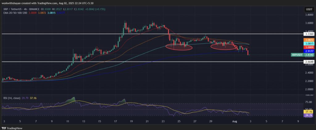 Pembeli berusaha mendorong harga XRP kembali di atas 20-day simple moving average (SMA) di $3,2, namun penjual berhasil mempertahankan posisinya. Per 2 Agustus, harga XRP berada di $2,8, turun lebih dari 4%.