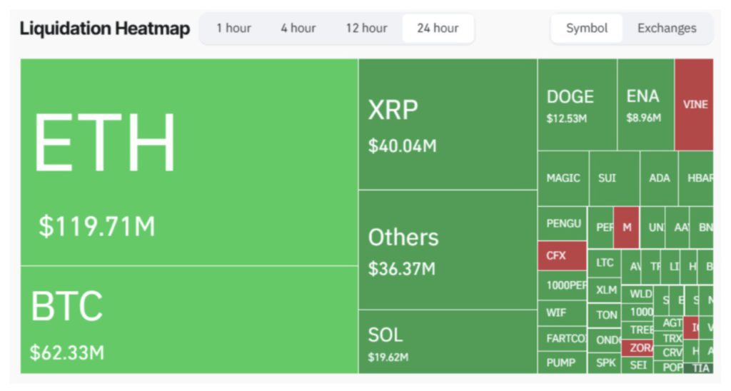 Di antara seluruh aset kripto, Ethereum memimpin gelombang likuidasi dengan sekitar $119 juta, disusul Bitcoin sebesar $62 juta.
