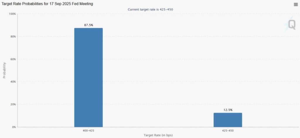 Peluang Federal Reserve memangkas suku bunga bulan depan semakin meningkat. Data dari CME FedWatch menunjukkan bahwa 87% investor percaya akan ada pemangkasan suku bunga sebesar 25 basis poin. Jika benar terjadi, suku bunga baru akan berada di kisaran 4% hingga 4,25%.