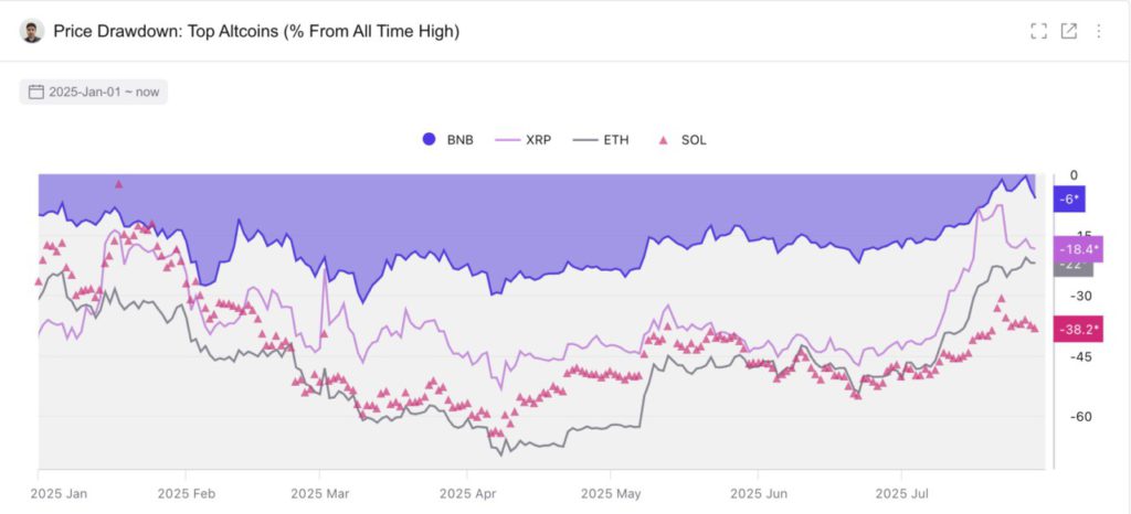 Binance Coin jadi salah satu altcoin berkapitalisasi besar yang menunjukkan struktur teknikal paling kuat di tahun 2025. Saat ini, harga BNB berada di kisaran $753 (sekitar Rp12.344.388), hanya terpaut 12,3% dari ATH. Sejak awal tahun, BNB bahkan belum pernah terkoreksi lebih dari 30% dari harga puncaknya—prestasi langka di pasar crypto yang sangat volatil.