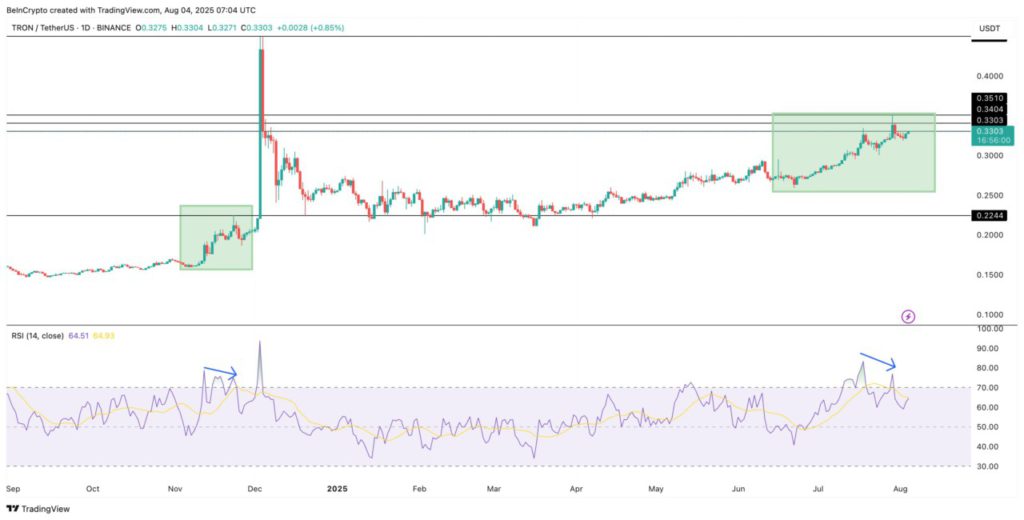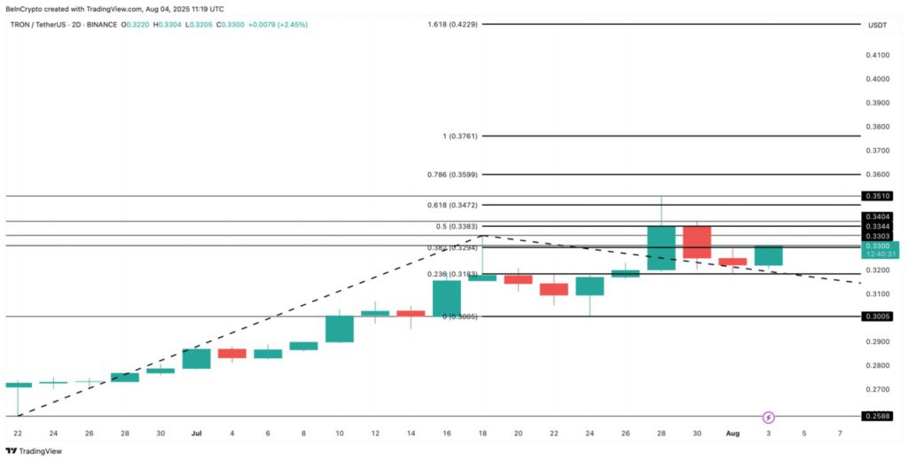 Kekuatan tren TRX didorong oleh pola fraktal bullish yang mirip dengan periode sebelum rally besar di akhir 2024, di mana harga sempat melesat dua kali lipat. Jika pola ini berulang dan resistance teknikal di $0,40–$0,43 (Rp6.558–Rp7.050) berhasil ditembus, target optimis ke $0,70 (Rp11.477) bisa dicapai dalam beberapa bulan ke depan.