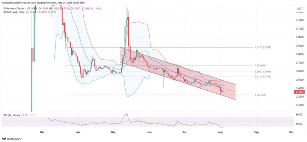 Jakarta, Pintu News – Harga Pi Coin hari ini, 4 Agustus, berada di level $0,354 setelah turun 2,94% dalam 24 jam terakhir. Koin ini sempat menyentuh harga terendah $0,32 pada hari Jumat. Namun, dengan pita Bollinger yang mulai melebar, muncul pertanyaan: apakah ini pertanda pemulihan harga akan segera terjadi?