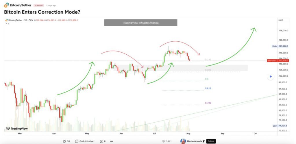 Salah satunya adalah Master Ananda, salah satu analis top di TradingView, yang pada 3 Agustus menyatakan bahwa pergerakan harga saat ini mencerminkan fase konsolidasi alami dalam siklus bull jangka panjang Bitcoin.