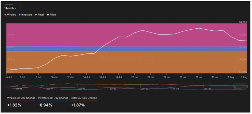 Sinyal pertama muncul dari data on-chain terkait distribusi kepemilikan ETH. Dalam 30 hari terakhir, kepemilikan oleh whale naik 1,82%, sementara dompet ritel meningkat 1,87%. Biasanya, pergerakan whale lebih dominan dalam memengaruhi harga crypto karena besarnya volume yang mereka kendalikan.